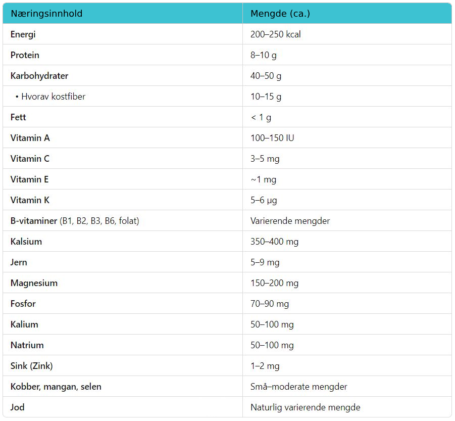 Næringsinnhold per 100 g (tørket, før tilberedning)